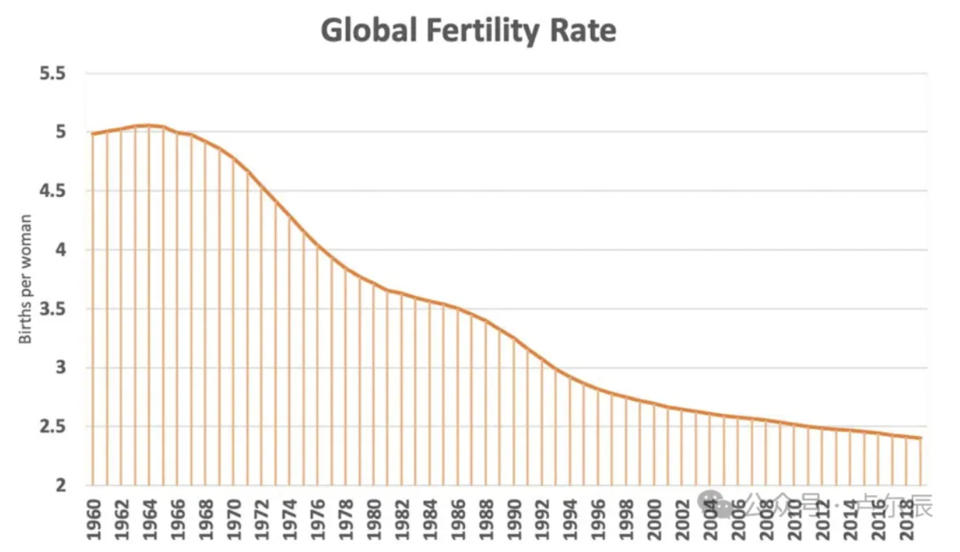 (Data show that the global fertility rate has been declining continuously since the 1960s.)